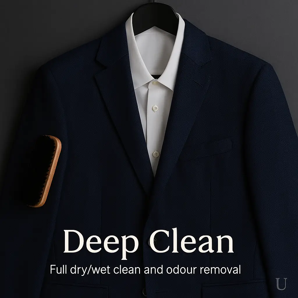 Full cleaning, odour removal, and pressing.